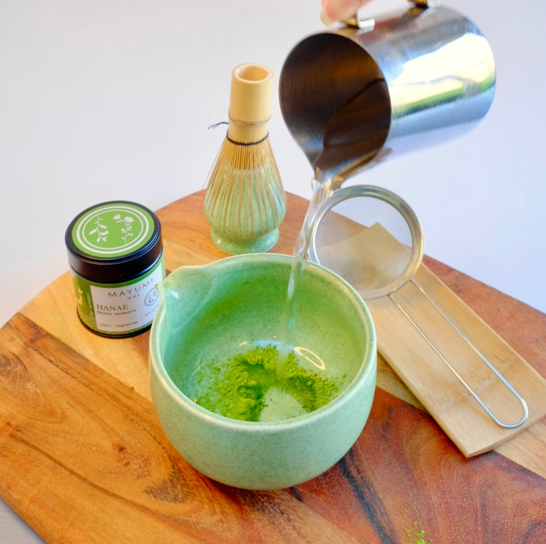 Verse 70 ml d’eau chaude (entre 70 et 80°C) sur le matcha tamisé. Une eau trop chaude altèrerait ses arômes et sa couleur vibrante.