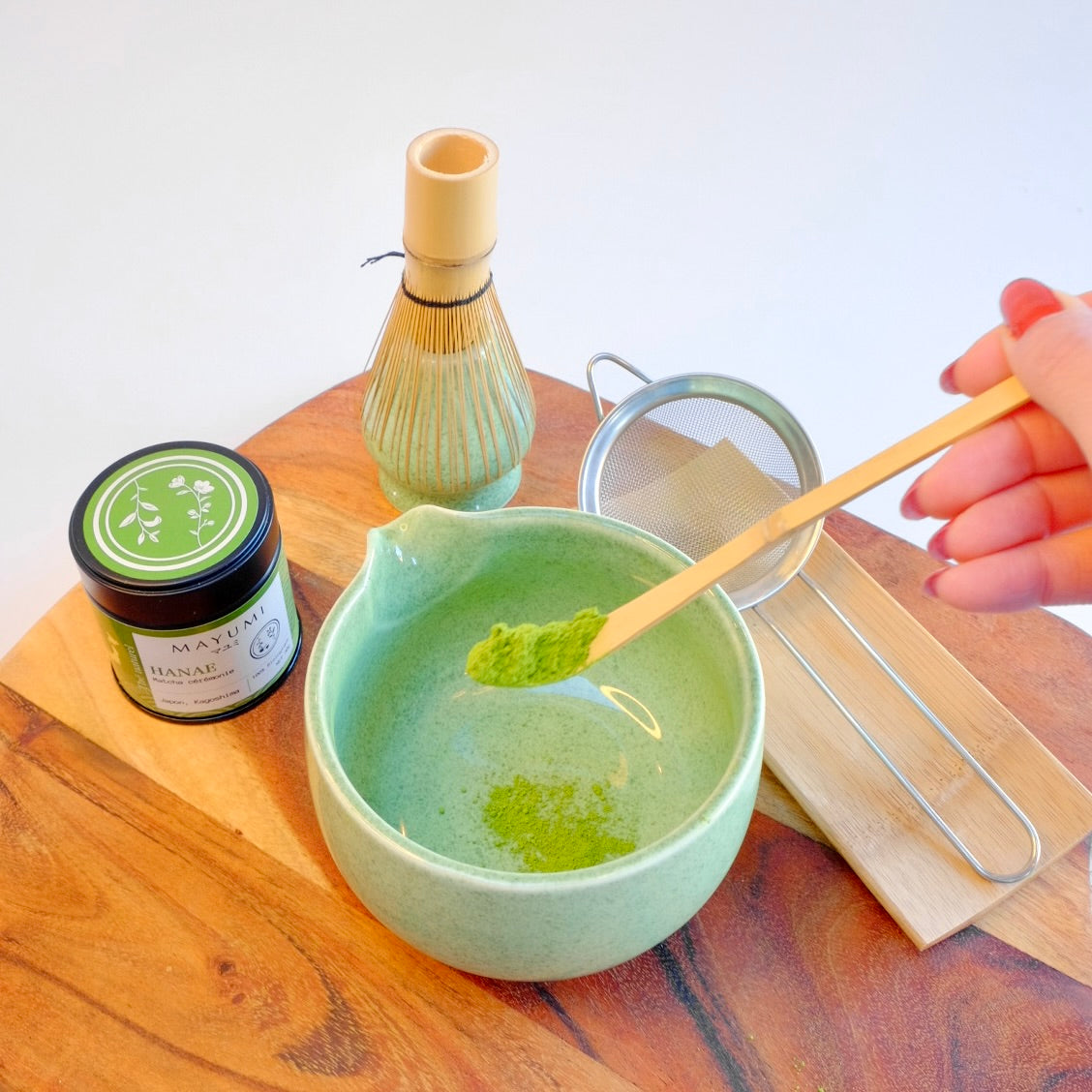 Ajoute 1 à 2 cuillères à café de matcha dans un tamis fin, puis fait tomber la poudre dans le chawan. Cette étape permet d’éliminer les grumeaux et d’obtenir une texture lisse et homogène.
